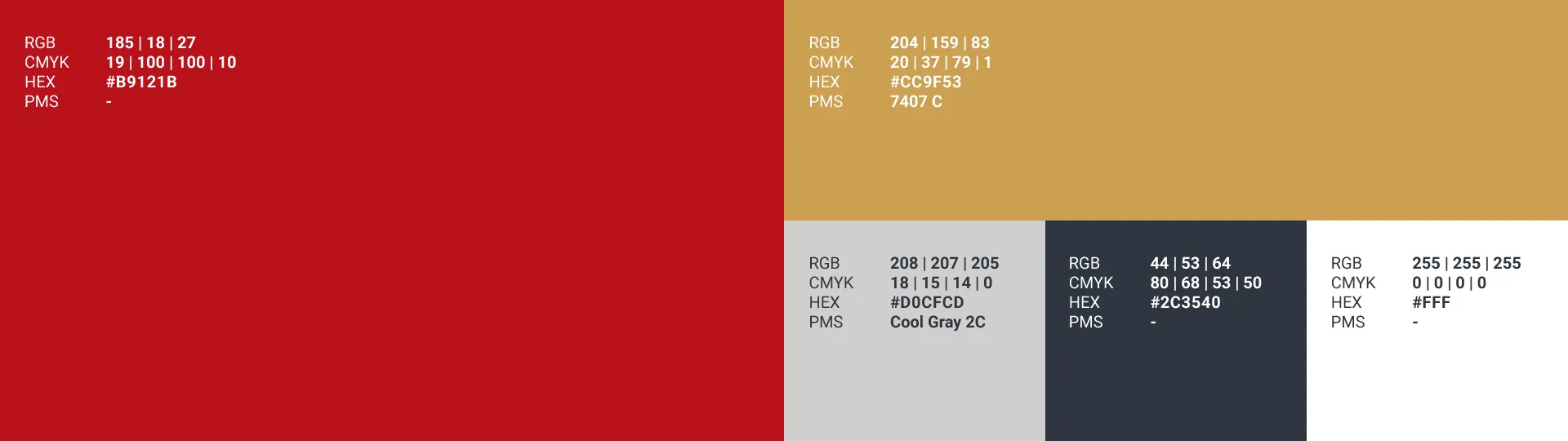 The primarycolours of red and gold are chosen to represent energy, passion, success and high quality, while the use of grey and dark blue as auxiliary colours adds a touch of elegance and modernity to the overall feel.